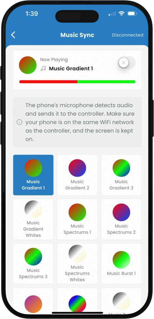 Music Sync brings your lighting to life with rhythm‑based effects.